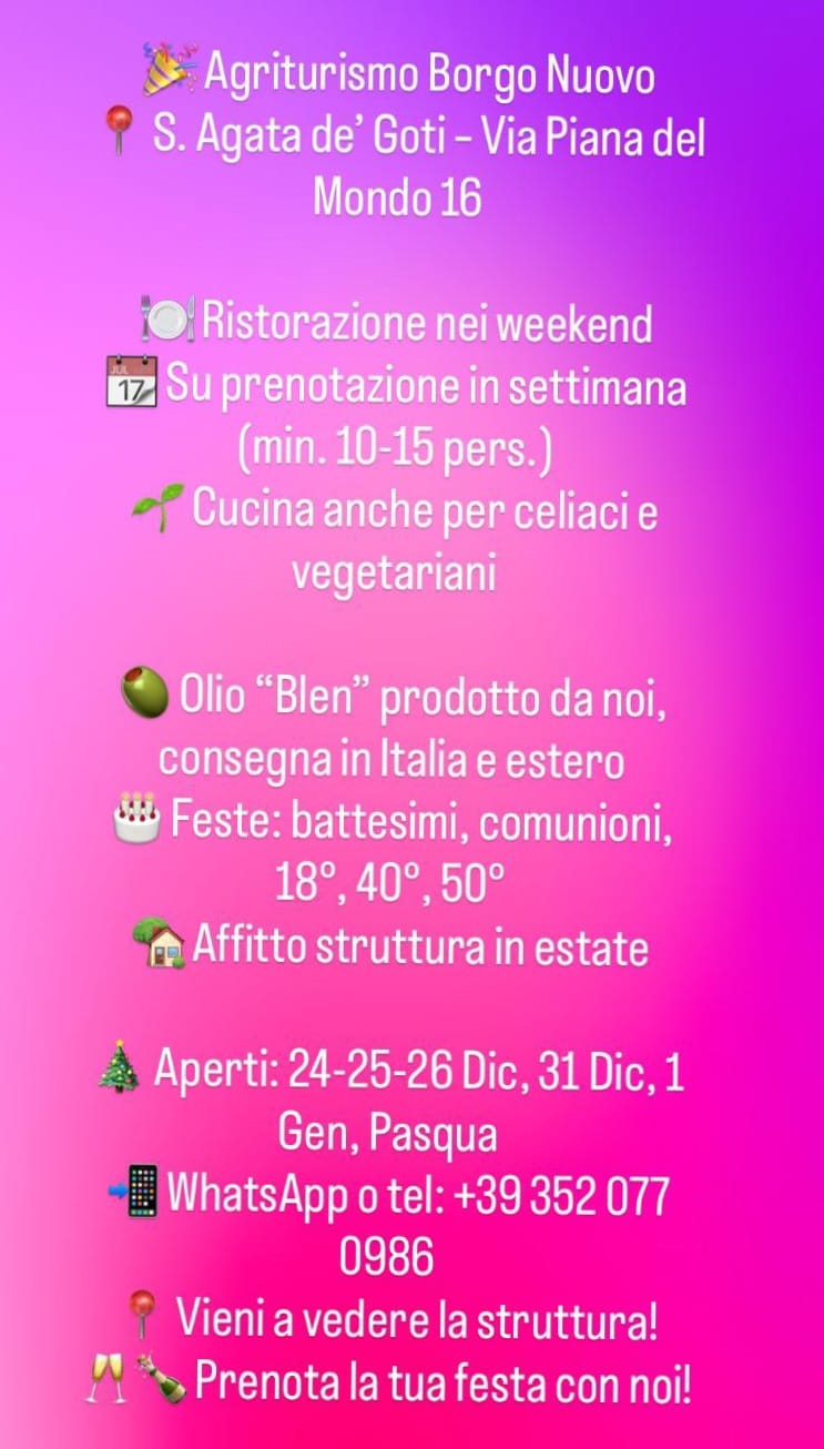 Tre giorni di puro relax tra natura, buona cucina e ospitalità sincera. Piscina impeccabile, lettini comodi e silenzio assoluto; la sera il ristorante è una coccola, con ingredienti della loro azienda agricola che fanno davvero la differenza. Personale disponibile e cordiale, prenotazione semplice e ottimo rapporto qualità/prezzo: BORGO NUOVO S.R.L.S. è diventato il nostro punto di riferimento vicino Benevento.